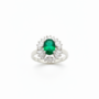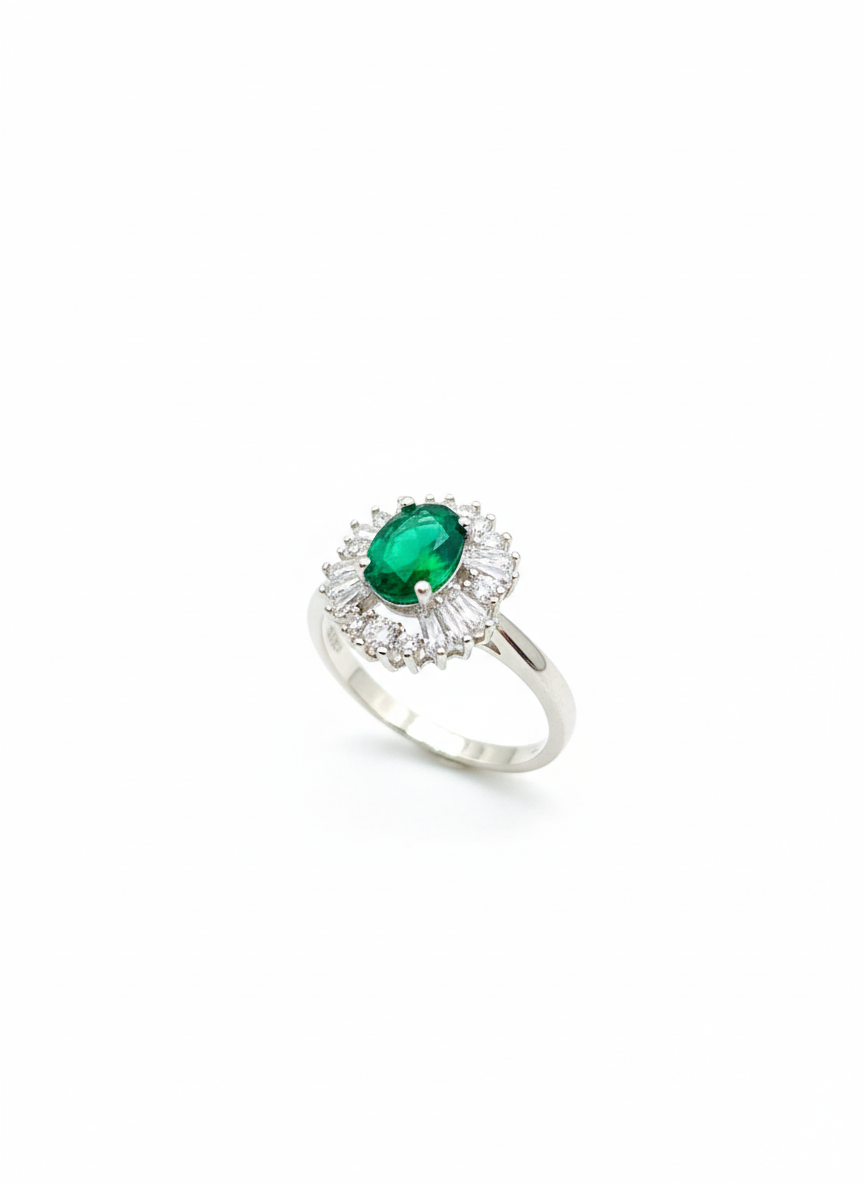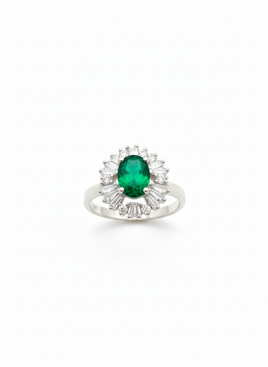 Add a touch of royal elegance to your jewellery collection with this beautifully crafted 925 sterling silver ring. Featuring a rich emerald-green oval center stone, this ring is designed to stand out with timeless charm. The centerpiece is surrounded by a dazzling halo of baguette and round-cut accent stones, arranged to create exceptional sparkle and depth.