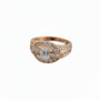 This sophisticated ring masterfully blends Art Deco geometry with modern elegance. Crafted in high-polish Pure Silver (925 Sterling), the design centers on a sparkling emerald-cut cubic zirconia or diamond simulant held securely by four prongs. The centerpiece is uniquely accented by a structural “bridge” of channel-set baguette stones that runs horizontally behind the center stone, creating a striking linear contrast. Softening the angles, the top and bottom of the setting feature curved arcs adorned with pave-set round brilliant stones, which extend elegantly onto the split shank. The rose-tone finish provides a warm, vintage appeal, while the interplay between the step-cut baguettes and the brilliant-cut rounds offers a dynamic return of light.